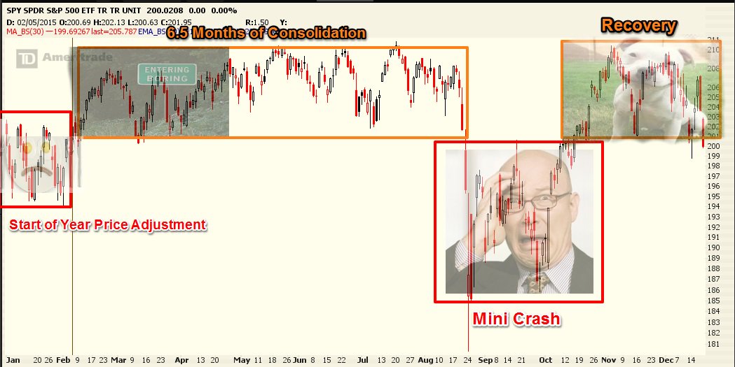 Throughout 2015 the market would collapse, rally, and then close exactly where it started the session at. It happened far too many times to be coincidence. Which is why I think this market will close 2015 exactly where it started it at. Poetic don't you think?