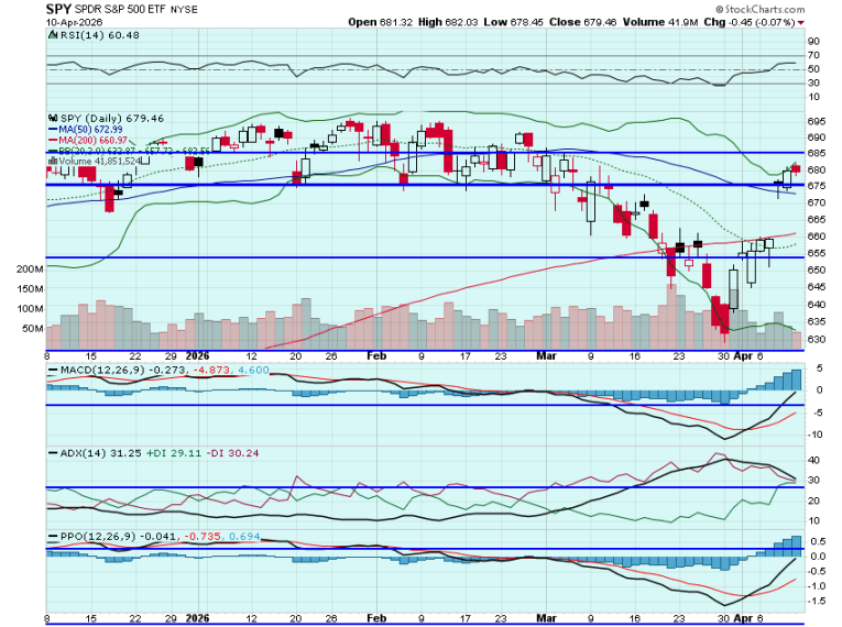 It is a big week for markets with the Q1 earnings season kicking off including NFLX earnings Thursday. We also get PPI data tomorrow. I would love to be optimistic but until this Middle-east situation is fixed, makes it hard to hold upside positions. That $676 area continues to be key support/resistance and then the 50dma at $672.99: