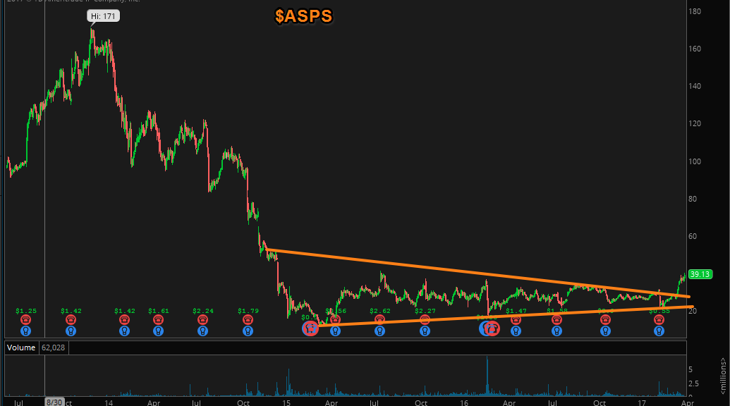 $ASPS's chart looked on the cusp of a possible breakout last week. Going through recent financials and filings, I found a company on the mend, a possible turn around story. I entered some April calls to take advantage of this potential move higher. After doing some more research I found out not everyone held my same view.