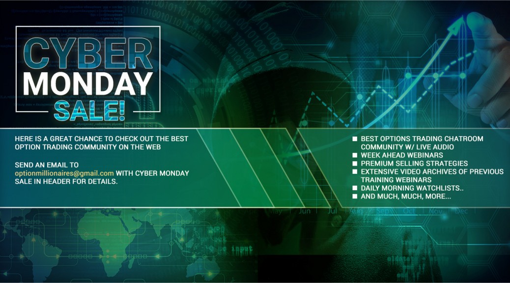 Here is a great opportunity to check out the best Option Trading Community out there. This holiday week we have a special extended-trial and promotional offer - for details send an email to optionmillionaires@gmail.com with "Cyber Monday Promo' in header. You can also click here.