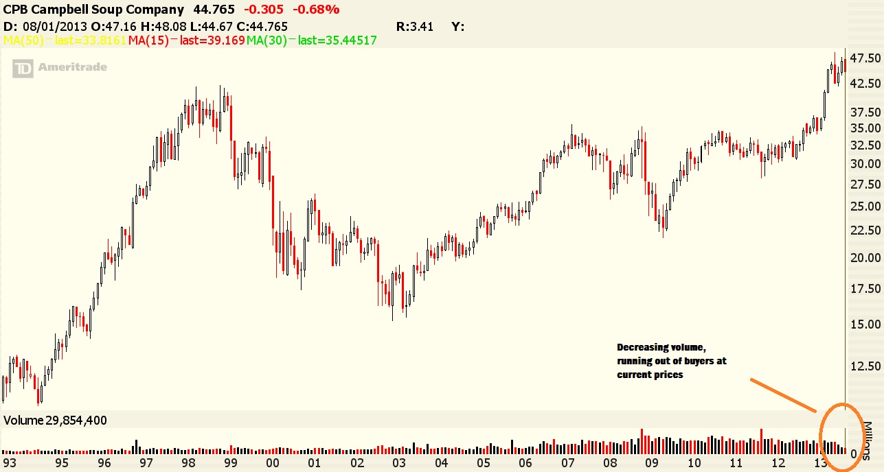 Here are some charts of $CPB. The stock has put in a double top. The recent volume indicates it is running out of buyers. Any selling pressure will send the stock to support at the $42 level before coming to rest in the mid $30 level.