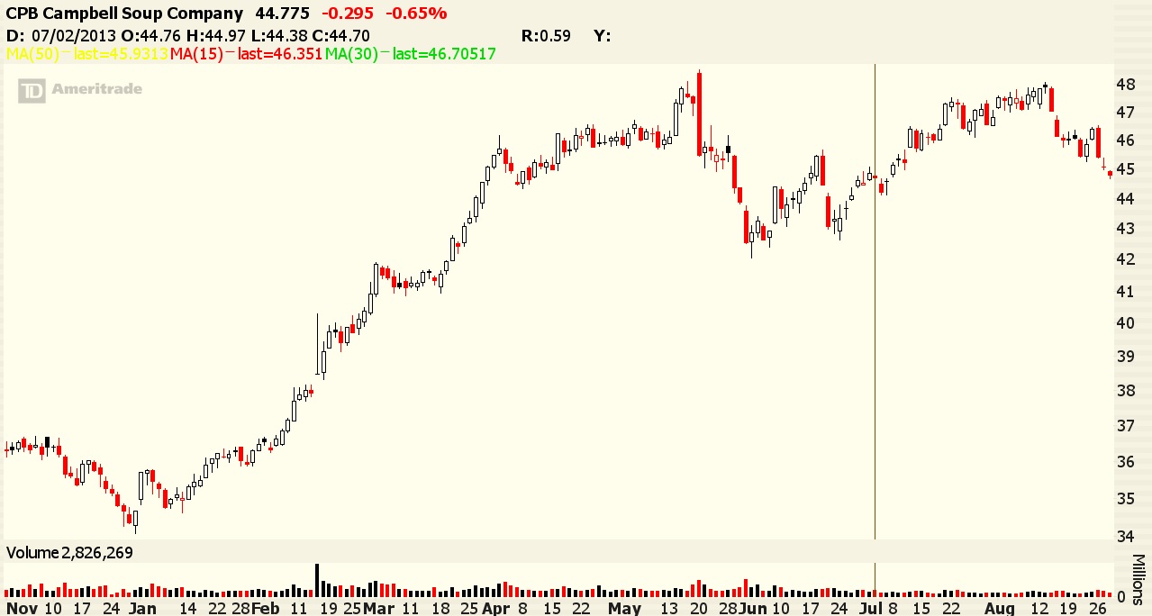 I covered Campbells Soup Company Sunday night in the optionmillionaires.com week ahead live webinar. The video archive for the webinar can be found here: https://www.optionmillionaires.com/forum/showthread.php/526-The-Week-Ahead-8-25-13 In it I stated that I thought $CPB was headed for a decline and I was looking to enter the out of the money PUT options. Since then the stock has fallen almost 5%. I think it may fall even further and that tomorrows earnings report will be the reason why. The stock is up some 40% since the start of 2013. Are there that many Cream of Mushroom cans flying off the shelves this year? The stock offers a nice 2.5% dividend yield, but as rates rise that will become a moot point.