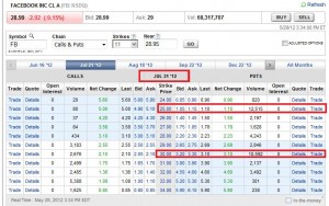 Option traders can now pile into the "Faceplant" team bus. FB stock options are actively traded in their first day of trading with much of the action showing option traders think Facebook will fall further. Facebook is trading almost 9% lower with only 20 minutes left in the trading day.