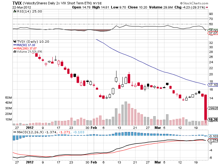 You see one night, awful data out of China and even worse economic data out of Europe, you know it going to be a volatile day. First thing you do is buy TVIX, which is SUPPOSED to give you a double return on market volatility. The VIX goes up over 6% on the day.. TVIX? Goes in the exact opposite direction. TVIX actually falls some 30%! Truly a spectacular move in the complete wrong direction. For those expecting a 10-12% return they instead got taken to the woodshed. How can this happen? TVIX holders should have been sitting on profits today, instead they got completely manhandled. TVIX dropped 30% in one day!