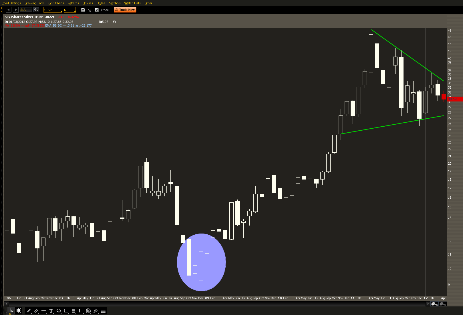 Silver will not trade staright up or down but the trend is still up in my opinion. Currently I view it as being over sold, longer term I see a beautiful bull flag, which could portend a break out. Silver has been surging since the FED announced its unconventional policies to deal with the Financial Crisis in 2008-2009. As long as the FED keeps printing, Silver will rise and the USD will fall. It won't be long before the U.S. Treasury issues the 1 Trillion Dollar Bill.