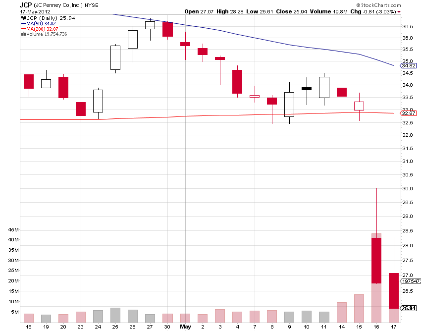The night of JCP earnings the stock was down over 10% after hours. In my market update video I said on a push to $30 I think the $28 and $27 puts would be worth a high risk trade. Sure enough JCP pushed up at the open and breached $30. At that point the puts were a prime risk trade opportunity. They did not disappoint.