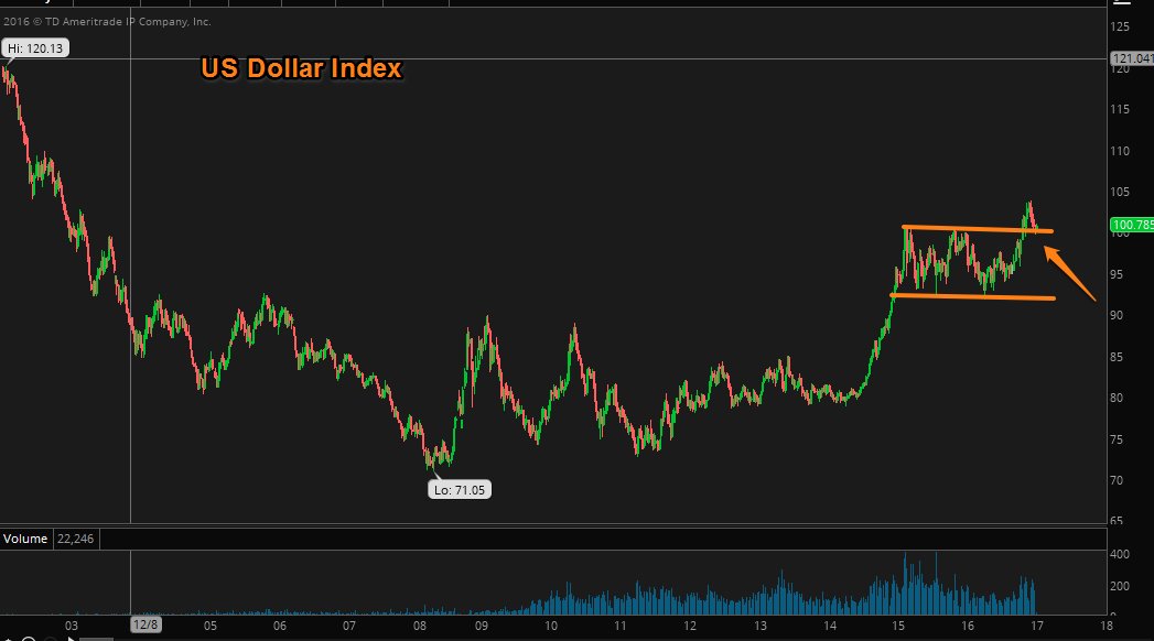 I'll be trading GLD and GDX puts for the next leg lower for Gold. I continue to watch the US Dollar index support at 100 hold. That is the top side of the 1.5 year bull flag formation.