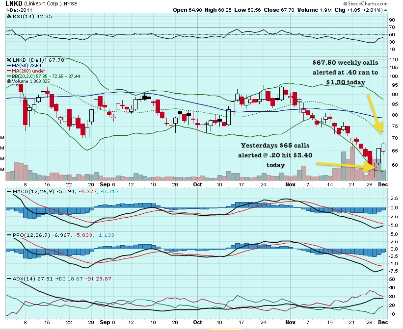 LNKD continued its ascent today, and shows how stocks can continue defy it's own fundamentals. We alerted the $67.50 Dec weekly calls @.40, on the morning pullback. LNKD then continued to surge late in the day to a high of $68.25. Our $67.50 calls went for $1.30, a nice 250% gain.