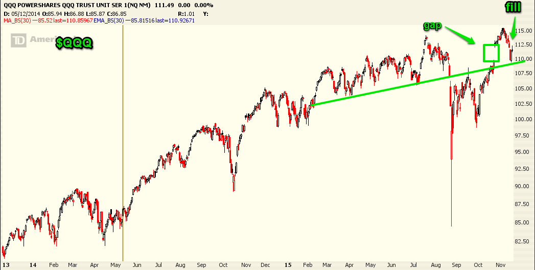 $QQQ came back to fill the gap from last month. The NASDAQ has been strong recently and with firm support looks poised to test recent highs.