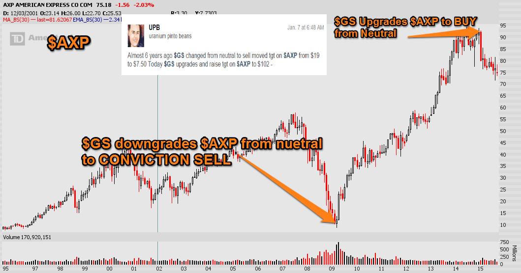 It's akin to the Goldman Sachs analyst who downgraded $AXP to a conviction sell in March 2009 when the stock was at $10 with a price target of $7.50.